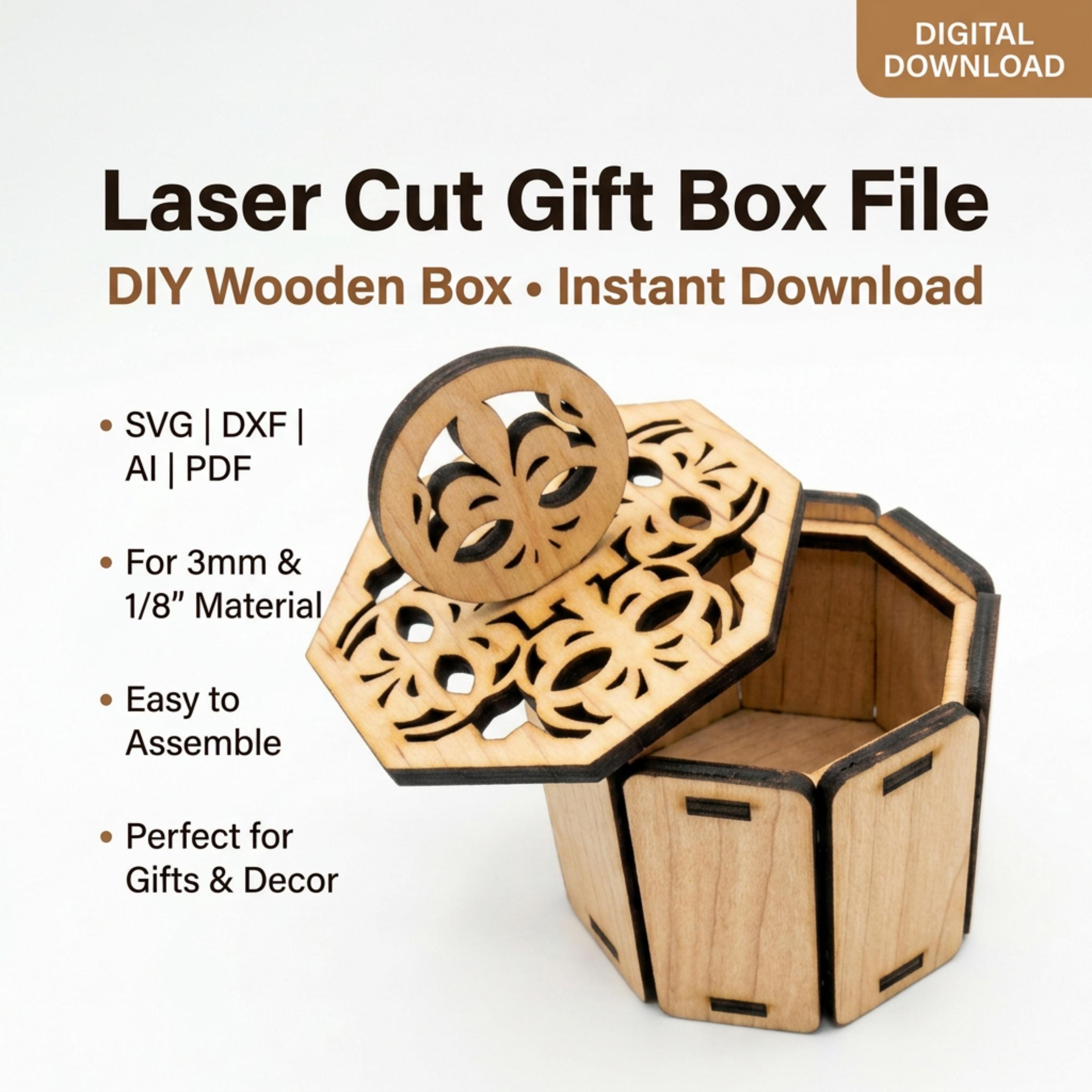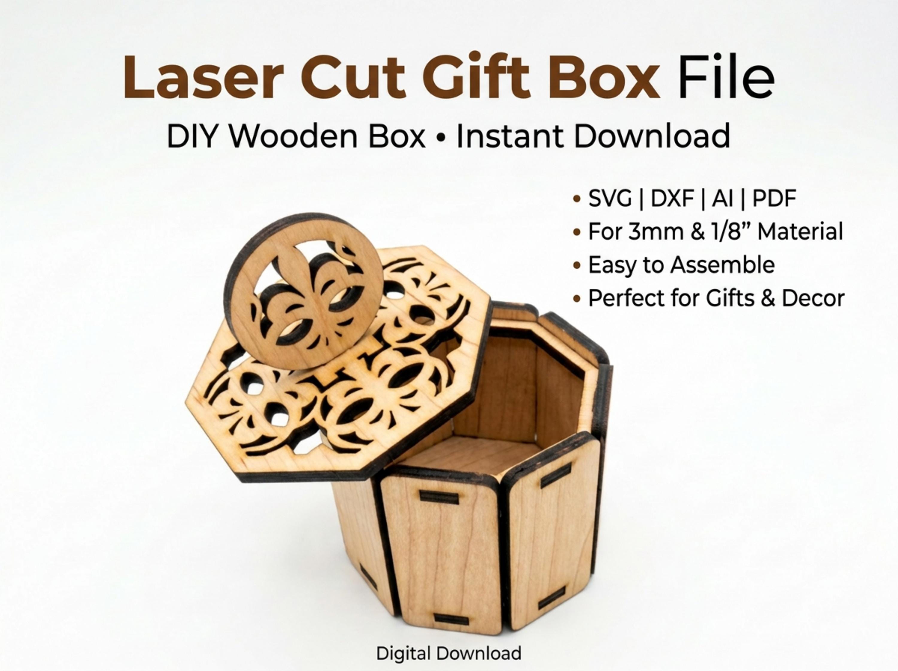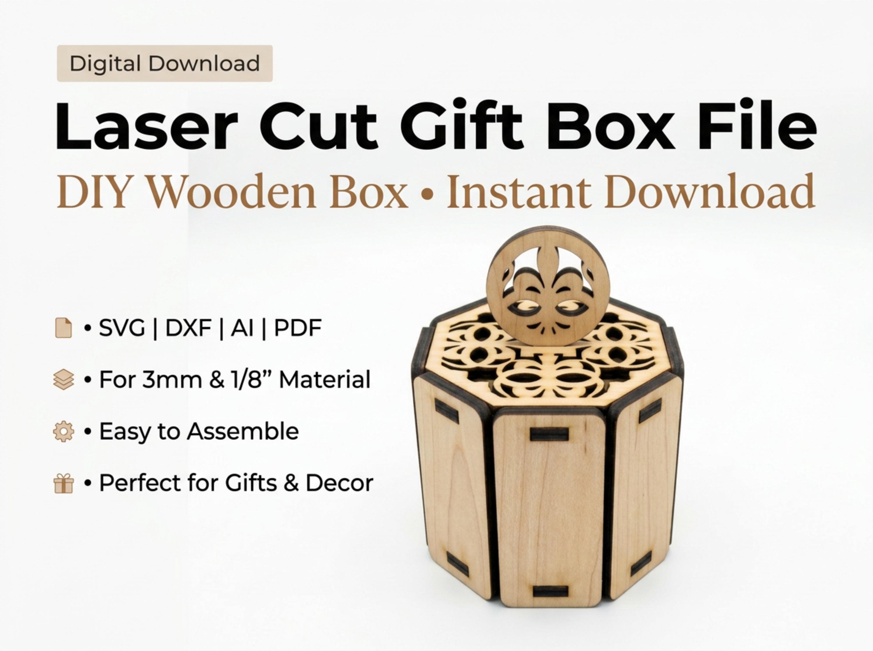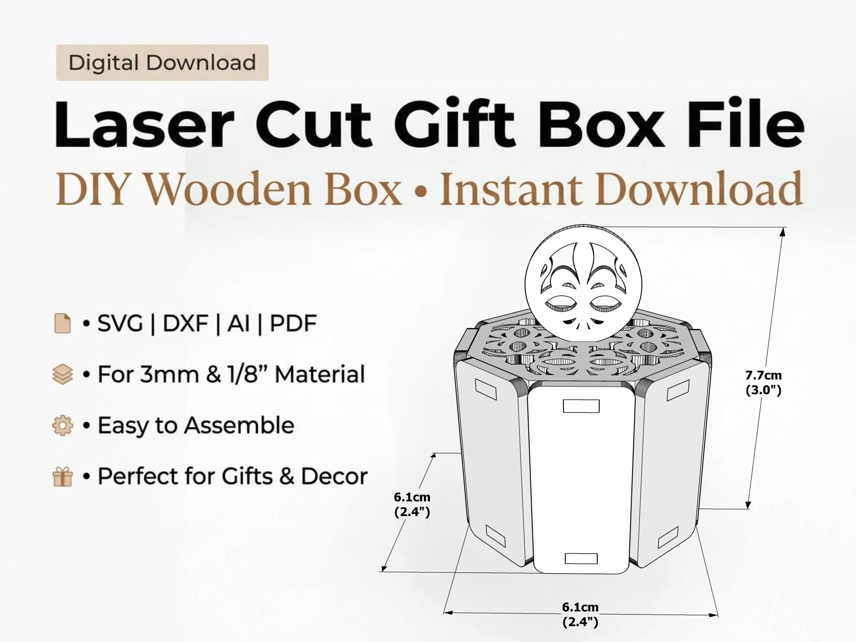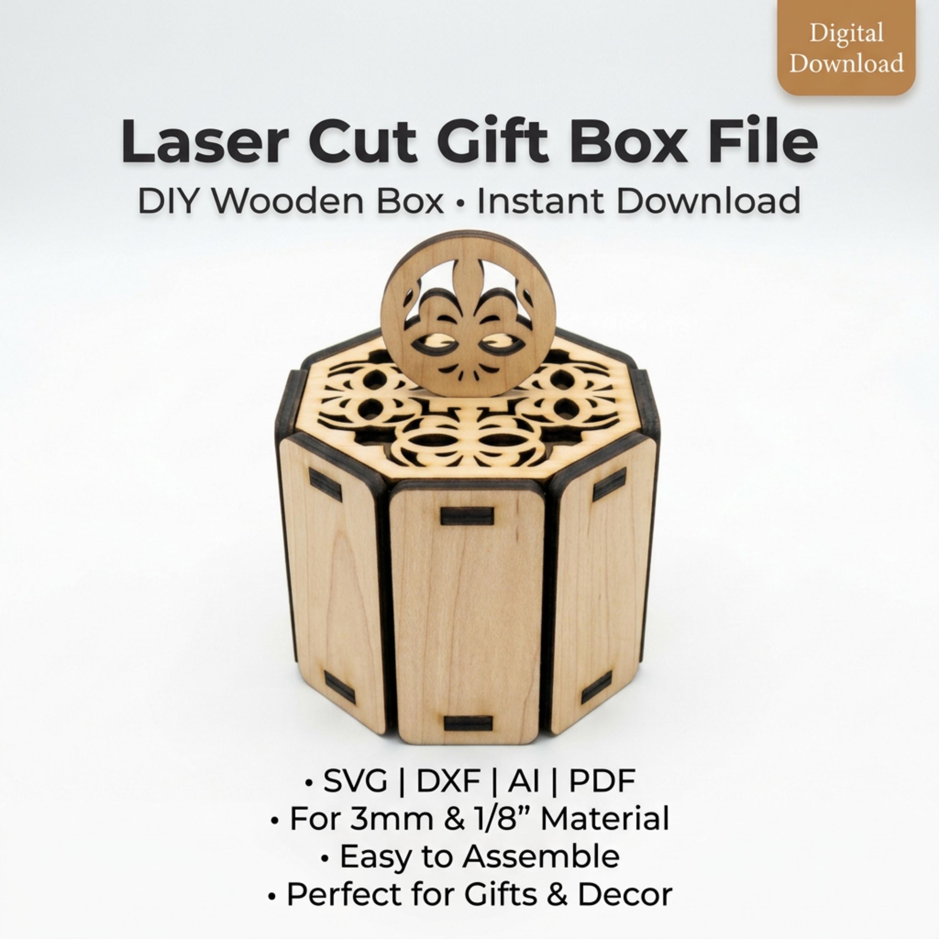 This intricate 6-sided wooden box features a beautiful filigree lid and a stylish circular handle, making it a perfect choice for wedding favors, jewelry packaging, or a decorative trinket box. Engineered for a perfect fit, this "Easy to Assemble" design is a must-have for any laser-cutting business.