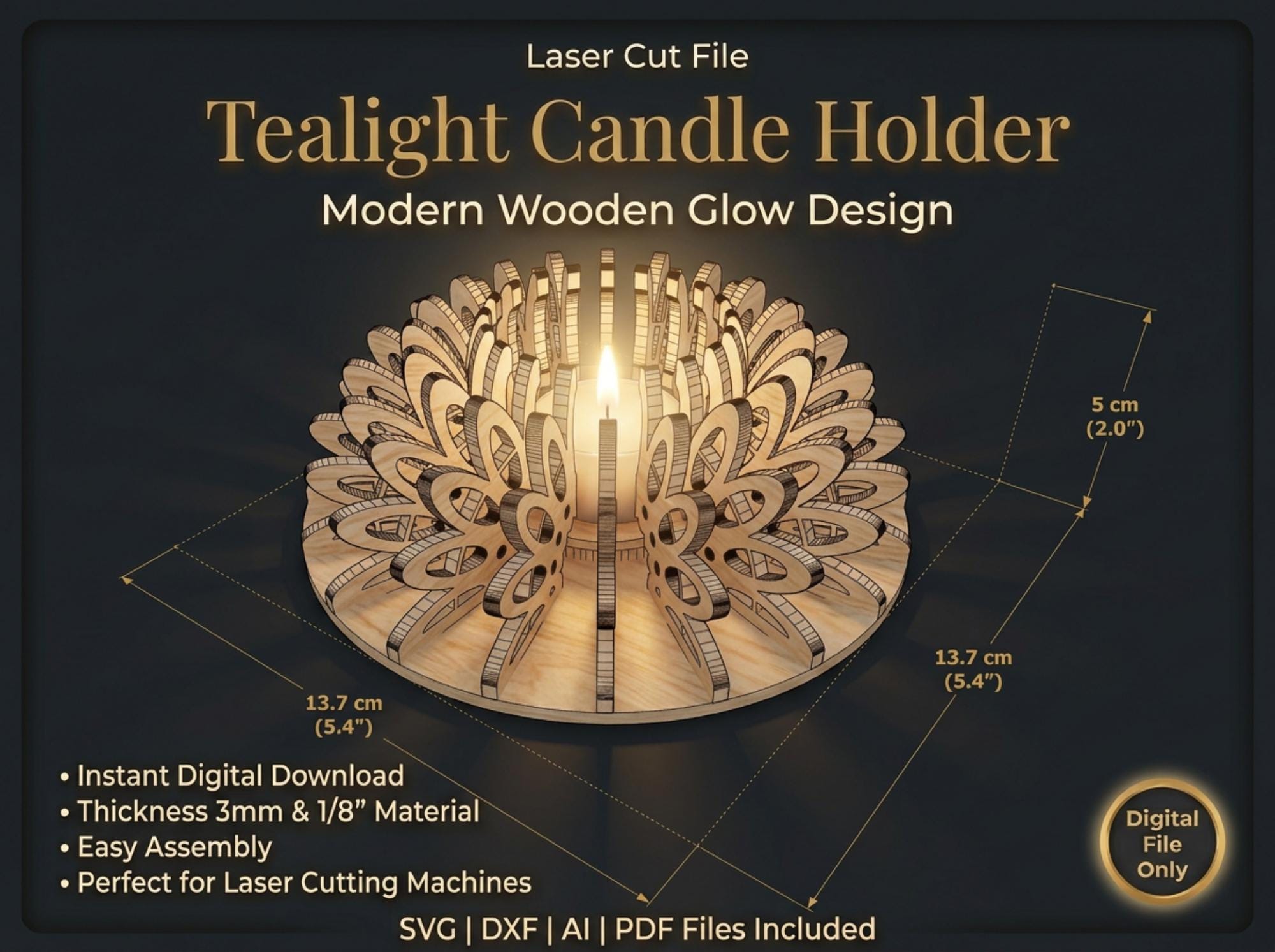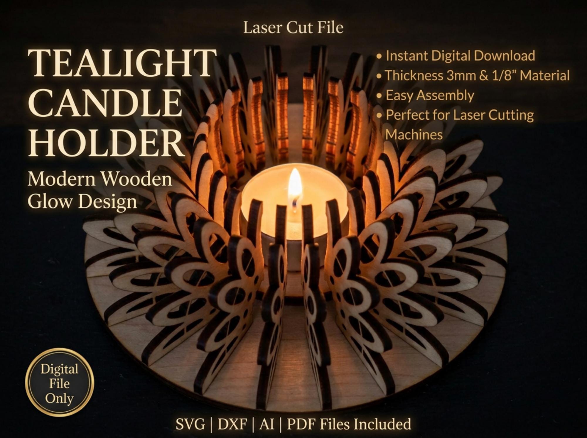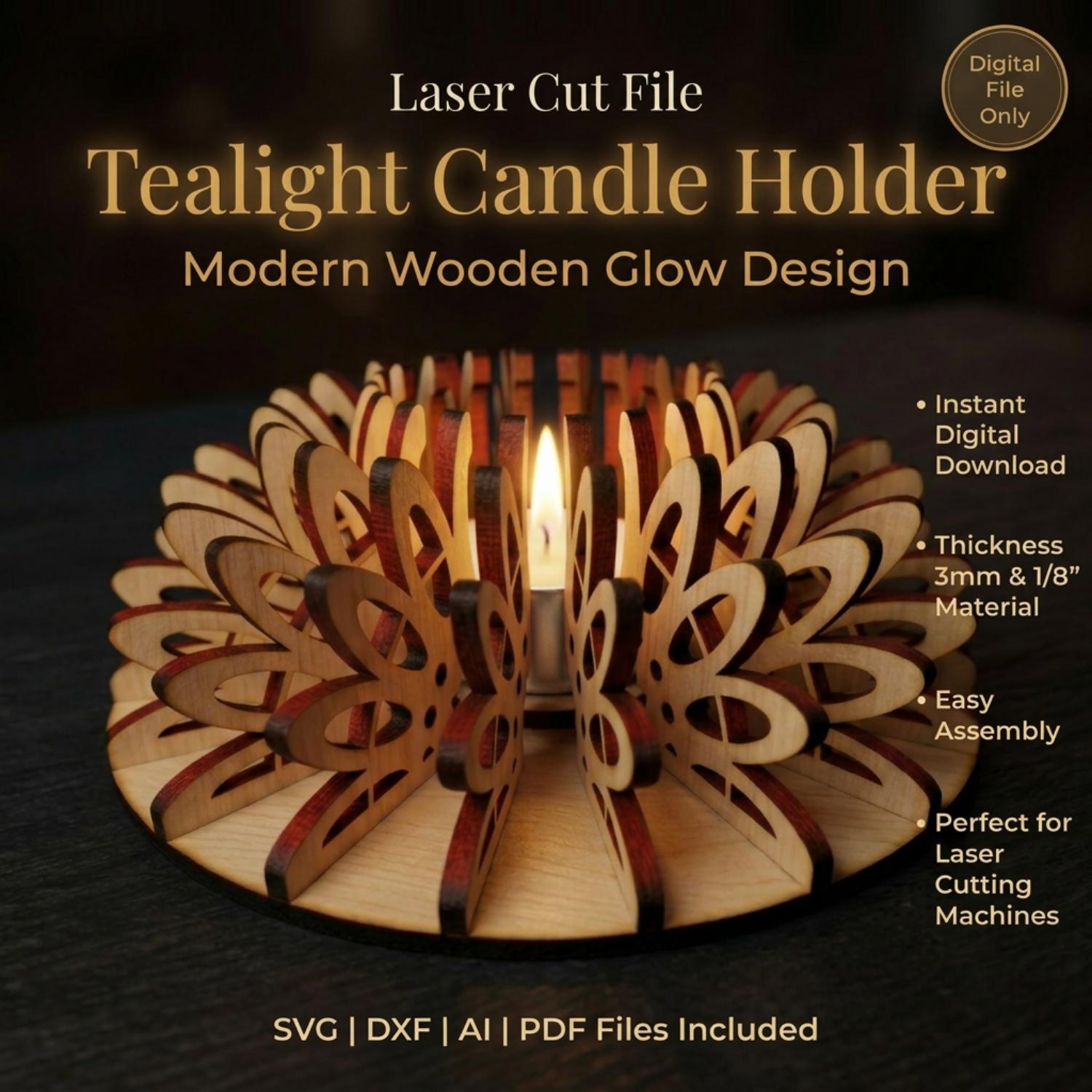 Create a stunning wooden tealight candle holder with this professionally designed laser cut file. This modern layered design produces a beautiful warm glow effect, making it perfect for home decor, gifts, or products to sell.