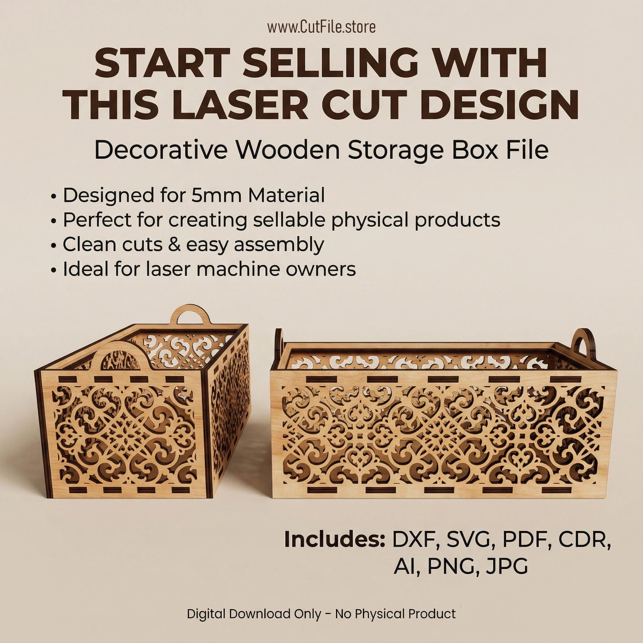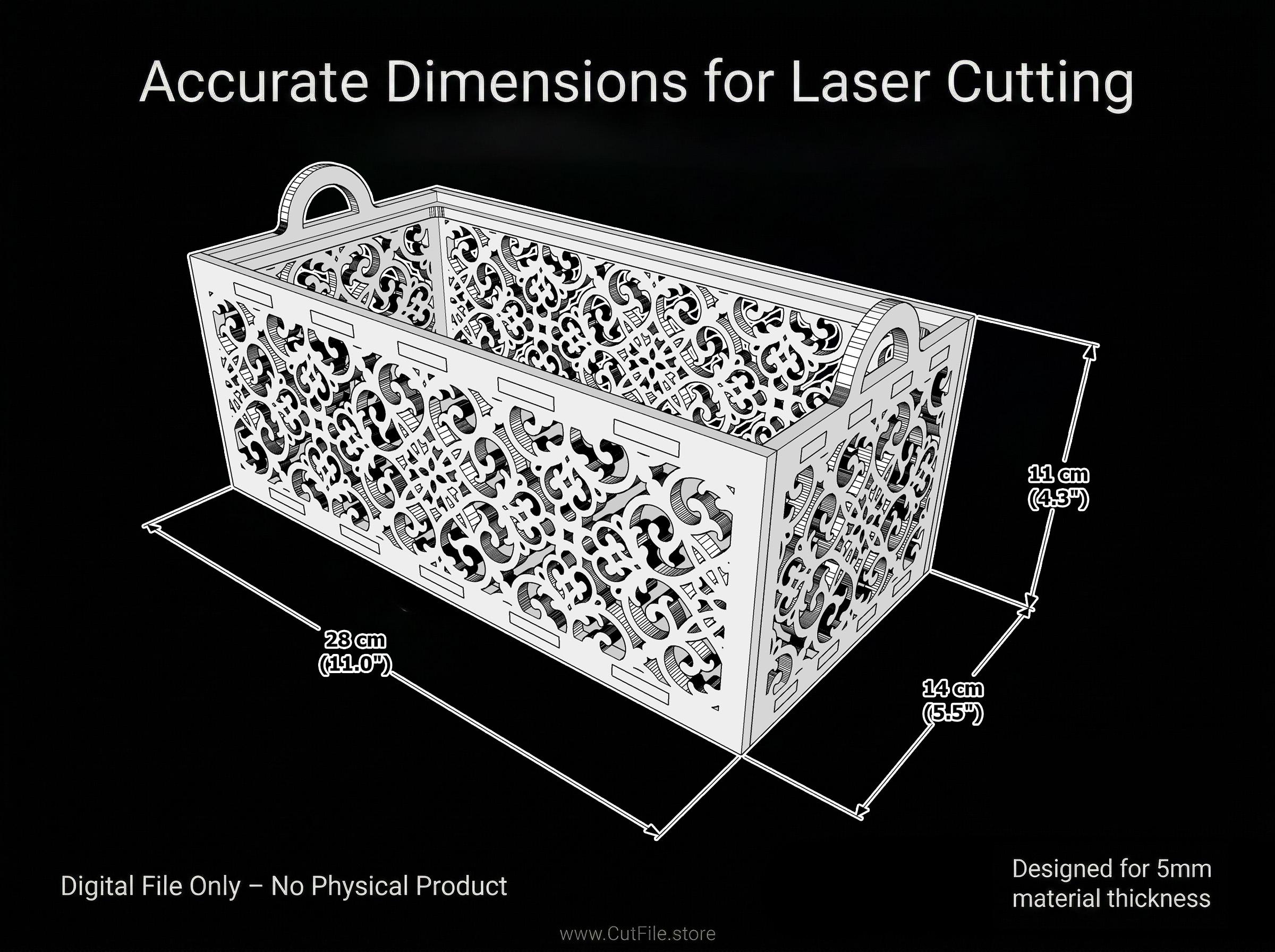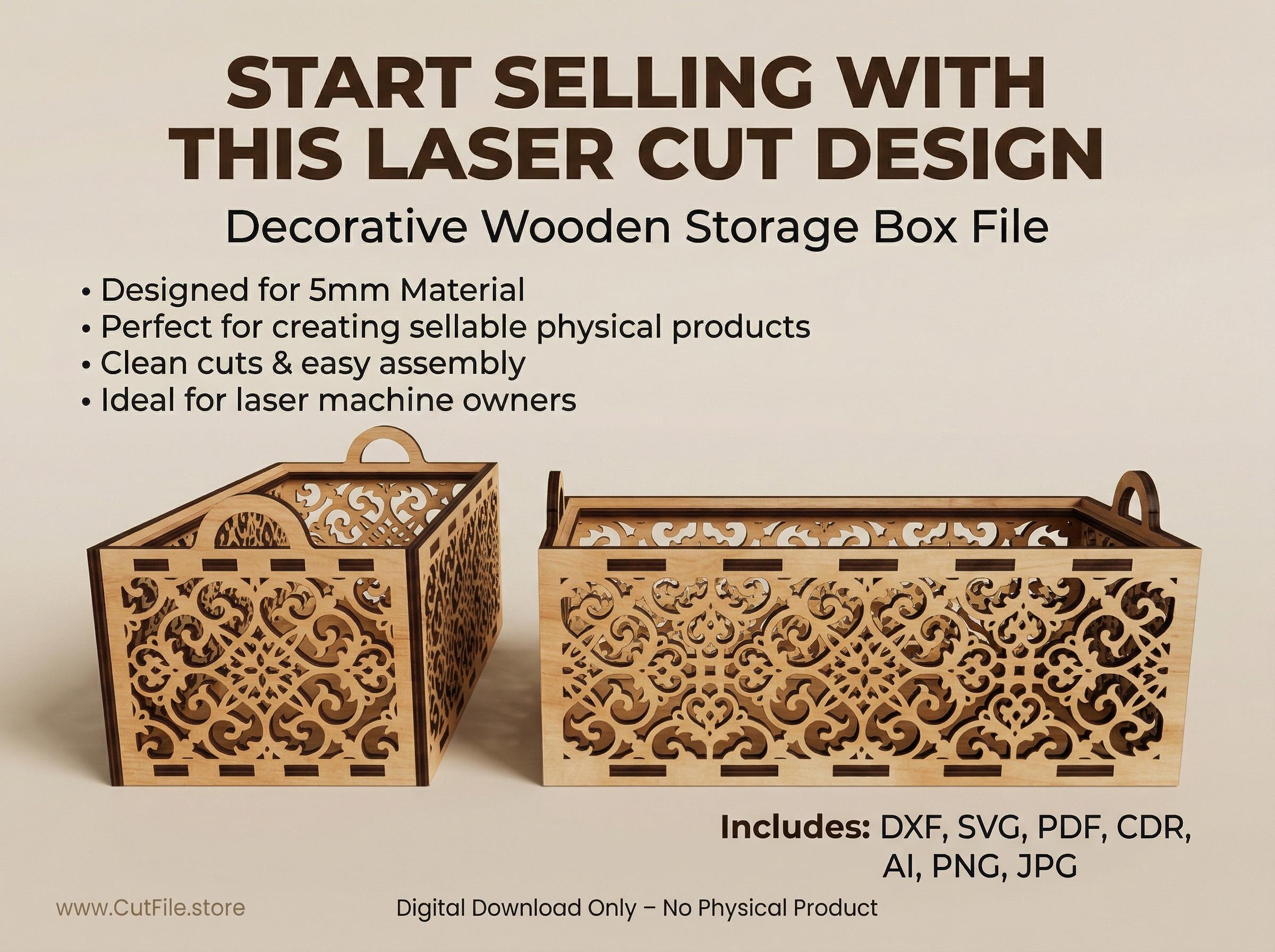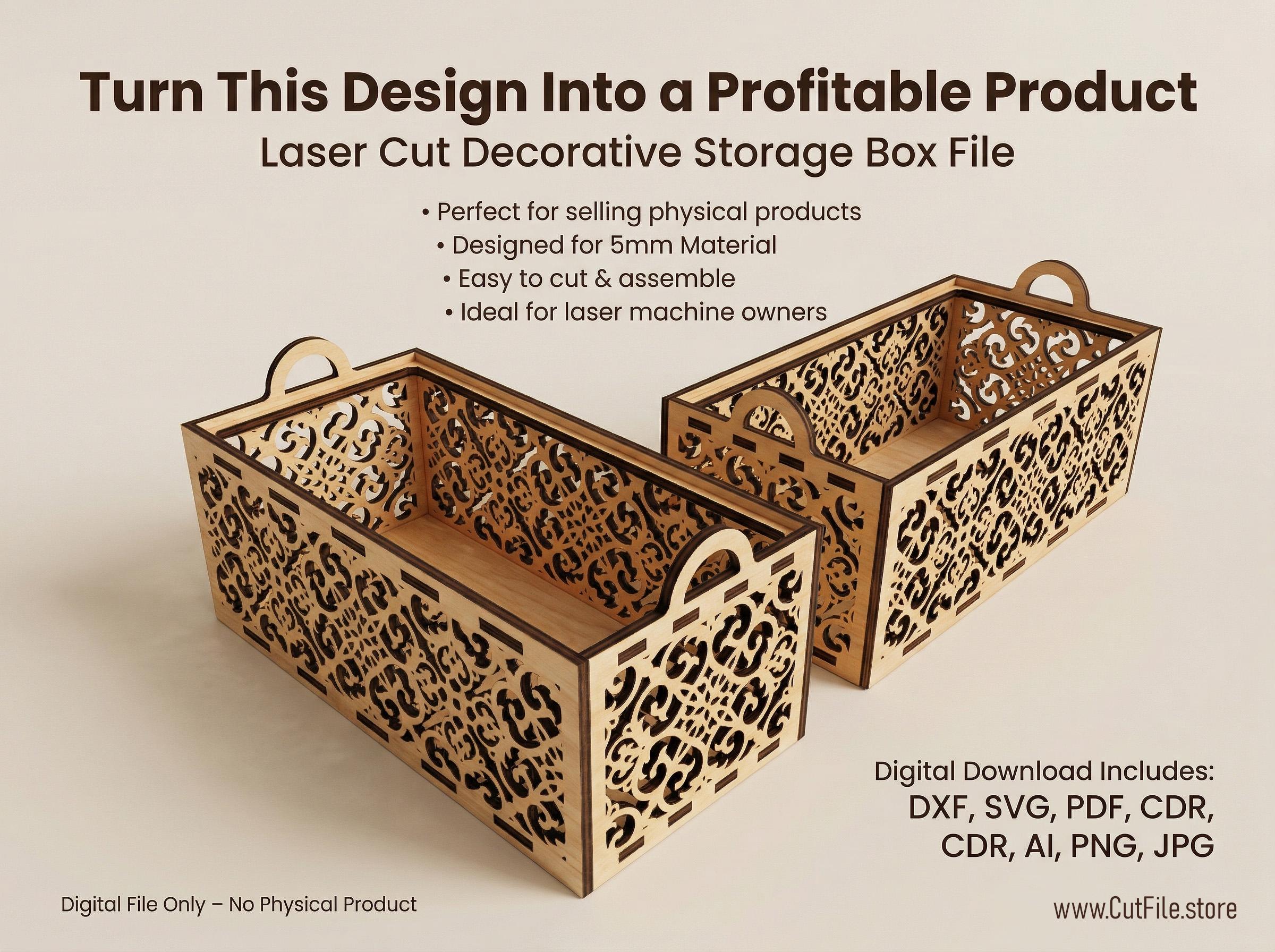 This decorative wooden storage box is designed for laser cutting and is perfect for creating high-quality products to sell. The detailed pattern gives a premium look while remaining easy to cut and assemble.