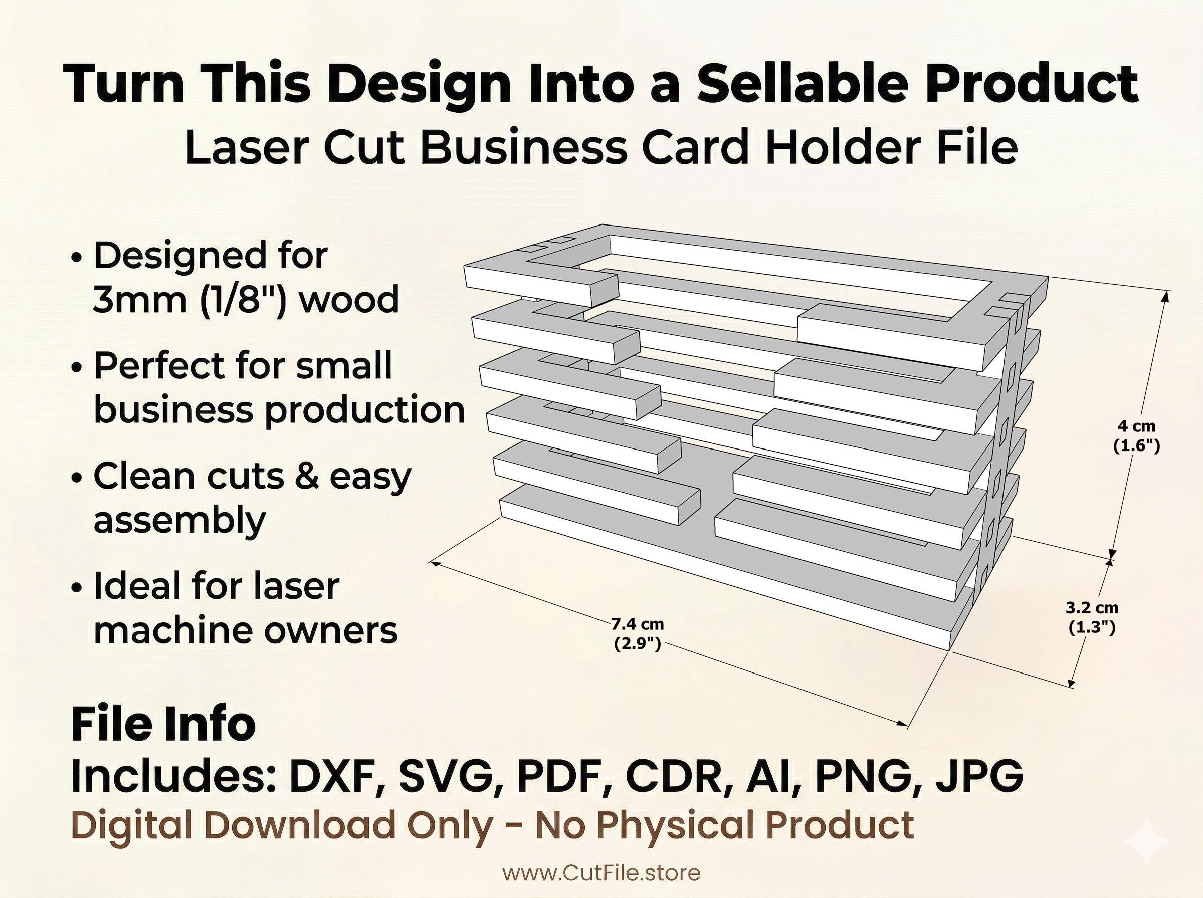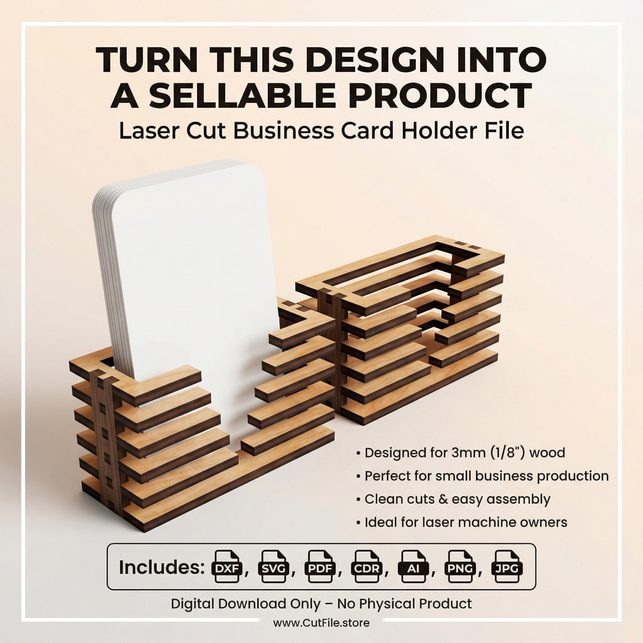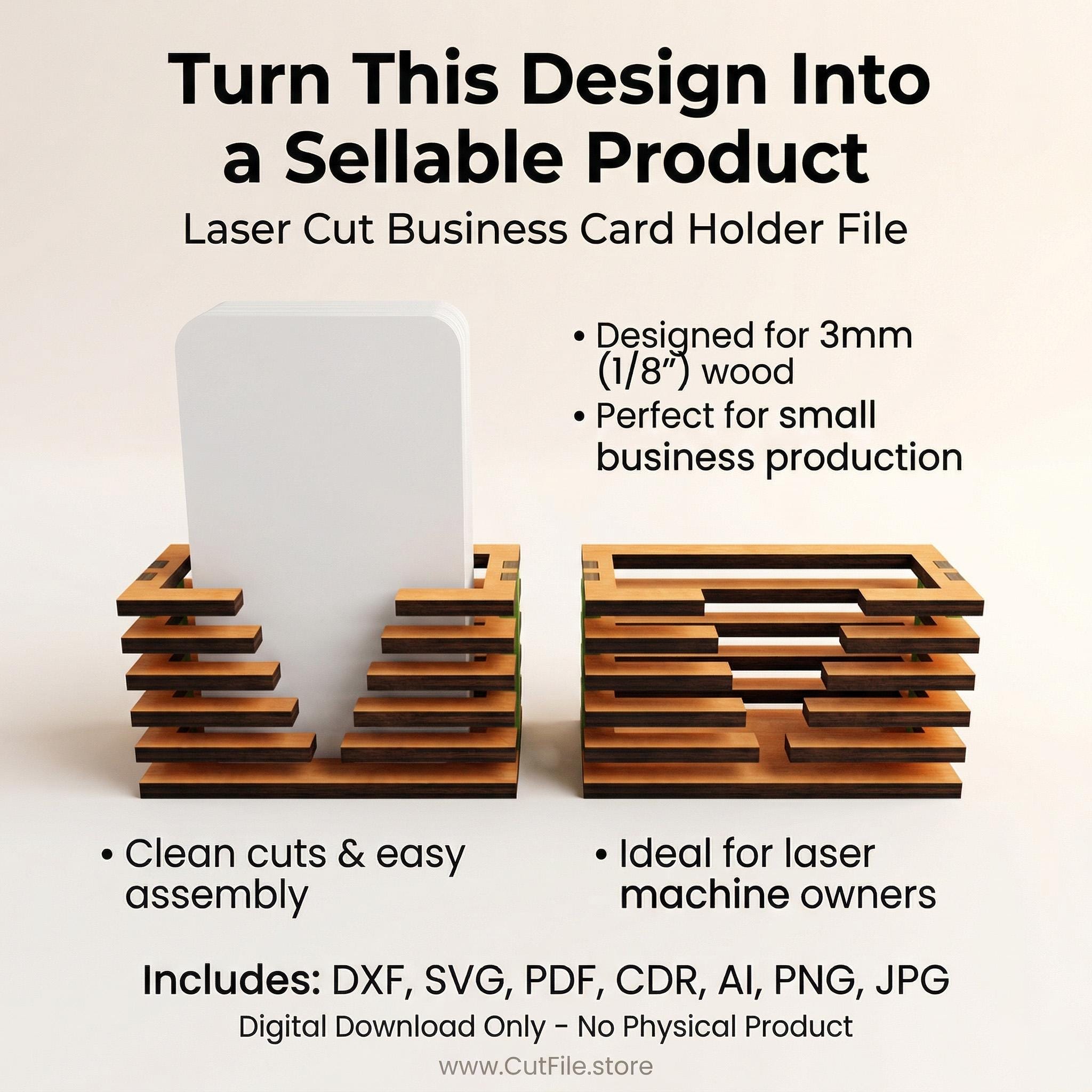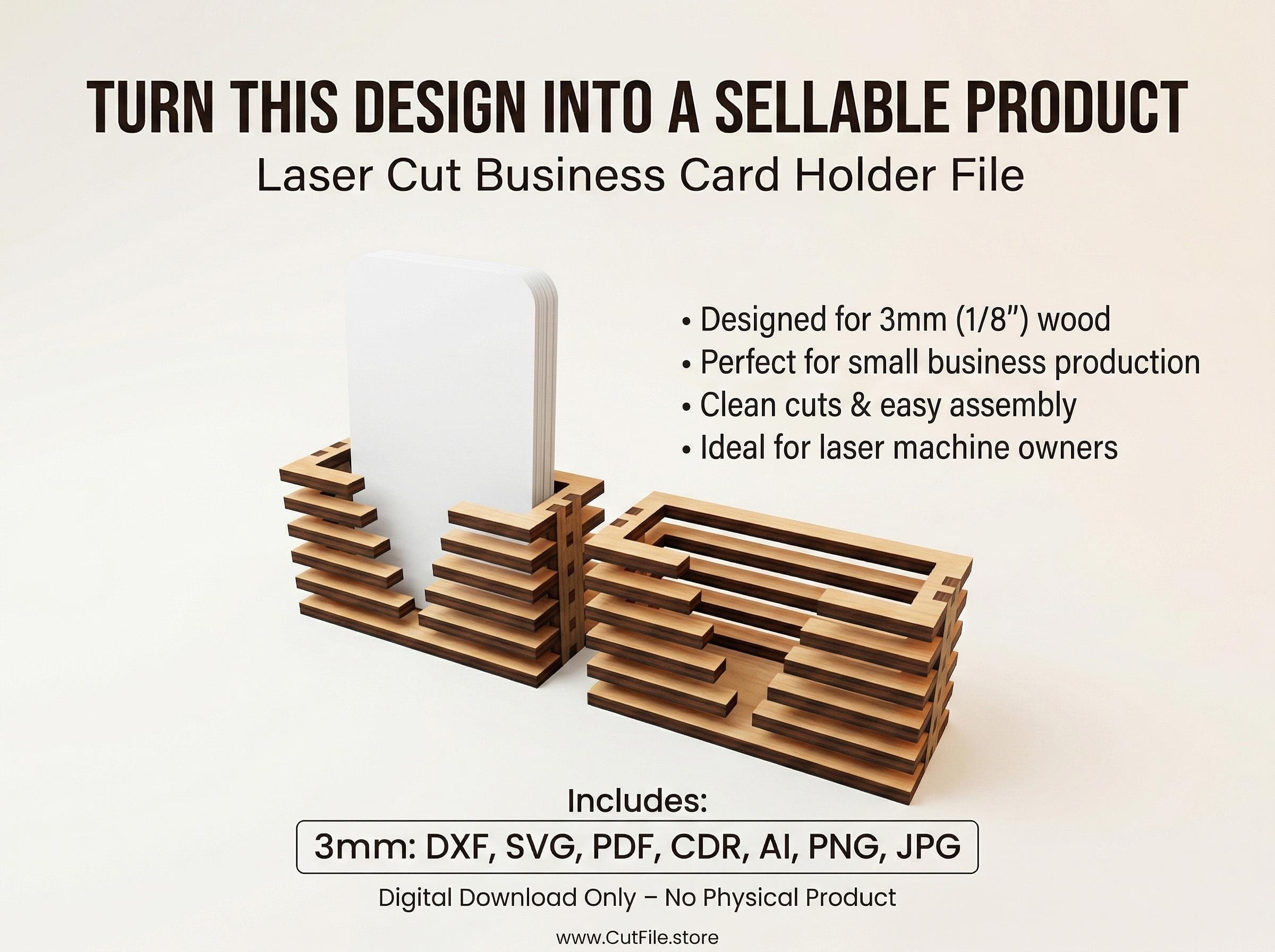 This modern business card holder is designed for clean, precise cutting and fast assembly, making it perfect for creating professional desk accessories to sell.